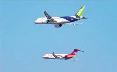这是国产飞机C919和ARJ21首次双机编队飞行表演,集中展示了两款飞机的良好飞行性能。截至目前,ARJ21飞机已累计交付150架,开通600余条航线,通航150多座城市,安全载客超1700万人次;C919飞机累计交付11架,开通9条航线,通航7座城市,安全载客70万人次。