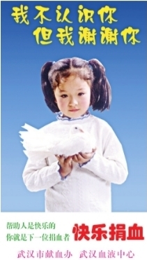 2000年,6岁半的刘佳雯成为武汉首位“无偿献血爱心大使”,伴随着“我不认识你,但我谢谢你”这句耳熟能详的广告语,小佳雯的形象出现在江城的大街小巷。2002年,世界卫生组织一位官员来汉访问,还将这张无偿献血公益海报带回国,并用镜框装裱悬挂在办公室。
