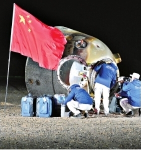 记者赶到着陆点看到,地面搜救队伍已到达现场架起灯光。灯光交汇处,工作人员正在返回舱附近有条不紊地开展工作。