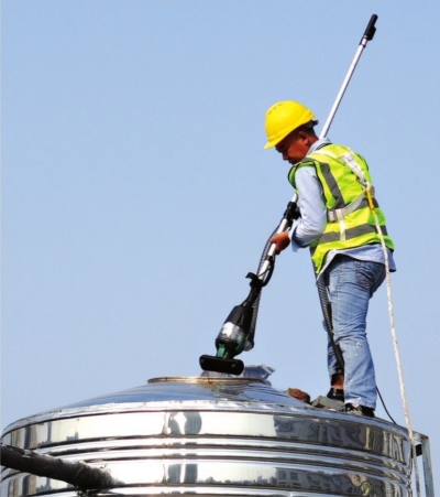只见清洗人员登上水箱顶端,将“机械臂”放入水箱内,它便灵活地探入箱体底部,顺畅地吸入泥垢。10分钟后,清洗完成。