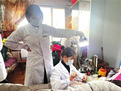 “我们今天把彩超机、心电图机都带来了,给您做个全面检查。您平躺好,先抽血。”准备工作就绪后,赵护士单膝跪地,半蹲着给蒋爷爷的右臂绑压脉带、涂碘酒、抽血采样,寇护士则默契地在一旁用便携式照明灯“补光”。抽完血后,赵护士随即将标本放置在标本转运箱内。