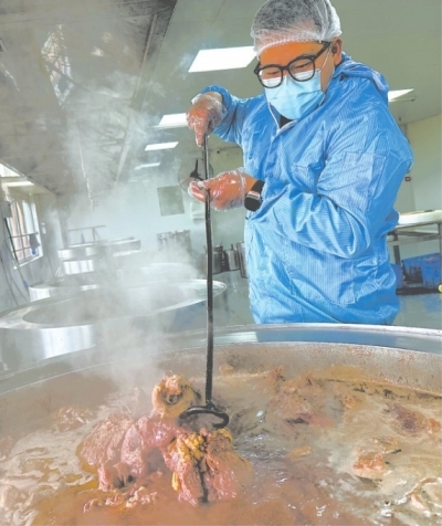 16公里外的走马岭周牛记食品厂卤味飘香,车间里14口大卤锅里正在卤制牛肉、牛肚、猪脚等。防尘服、防尘帽罩,31岁的周文杰“全副武装”地手握一根长铁钩,从锅中叉出一大块牛肉。牛肉随着铁钩翻转,他端详片刻后,向身旁的师傅点头示意“可以出锅了”。