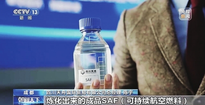 四川天舟国际贸易有限公司总经理陈宇:我左手拿的火锅废油,右边就是我们炼化出来的成品SAF(可持续航空燃料),餐厨废油我们把它统一收集之后,通过脱杂处理、加氢炼化,就可以跟传统的石化航煤进行无缝的掺混,添加到大飞机里面,实现全生命周期的减碳。