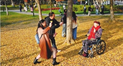 6日下午,阳光正好,我带上相机前往解放公园拍摄冬景。当镜头转向一片银杏树时,在熙熙攘攘的人群中,三个身影格外引人注目。