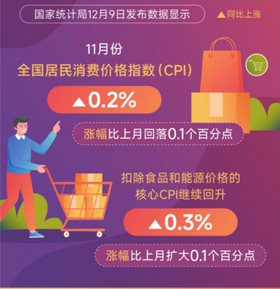 据新华社电 国家统计局9日发布数据显示,11月份,全国居民消费价格指数(CPI)同比上涨0.2%,涨幅比上月回落0.1个百分点;扣除食品和能源价格的核心CPI继续回升,同比上涨0.3%,涨幅比上月扩大0.1个百分点。
