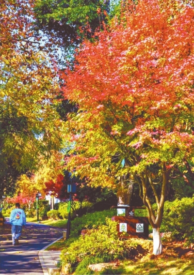 正值冬日,龟山上金色的银杏、火红的红枫、深棕的梧桐……色彩浓郁而缤纷。从龟山公园东门至蝴蝶泉的路上,景色尤为迷人。盘山路上,火红的鸡爪槭如同镶嵌在绿色山体之间的宝石,为寒冷的冬日增添了几分温暖和活力。龟山公园南门,鲜红的鸡爪槭与金黄的银杏相掩映,高饱和度的撞色被市民戏称为“番茄炒蛋”,成为龟山一处小有特色的点位。据了解,山上还栽植了乌桕、三角枫、梧桐、乌桕等色叶乔木,共计618株,营造出不输缤纷春景的多彩冬景。