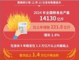 据新华社电 国家统计局13日发布数据显示,2024年全国粮食总产量14130亿斤,比上年增加221.8亿斤,增长1.6%,在连续9年稳定在1.3万亿斤以上的基础上,首次迈上1.4万亿斤新台阶。