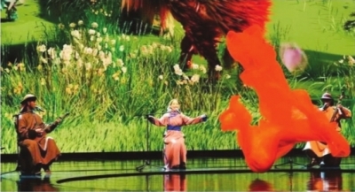 《呼麦·飘渺》中,呼麦是蒙古族人创造的神奇歌唱艺术,一位歌手能同时唱出两个声部,仿佛将草原的各种自然声音搬上舞台,古老的呼麦艺术搭配创新的空气动力飞纱装置,飞纱在舞台中翩翩起舞,营造出空灵、飘渺的意境,许多观众在演出后表示,“飞纱让歌声和草原的风具象化”;