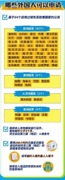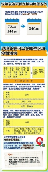 符合条件的俄罗斯、巴西、英国、美国、加拿大等54国人员,从中国过境前往第三国(地区),可从24个省(区、市)60个对外开放口岸中任一口岸免签来华,并在规定区域停留活动不超过240小时。与72/144小时过境免签政策相比,此次政策调整最大特点是允许跨区域通行,即过境免签的外国人可以在24个省(区、市)允许停留活动区域内跨省域旅行。