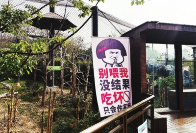 12月19日,记者在武汉动物园金丝猴饲养区看到,近百米长的栈道上挂起了数十张醒目的海报,有的以科普为主,A4纸大小的海报上手写了金丝猴的饮食习惯等,“以理服人”劝阻游客不要投喂;有的更加直接,把当下最火的表情包融入海报设计:“别喂我,没结果,吃坏只会伤害我”“别投食啦你”……用网络流行的话语劝阻投喂。其中最大的一张海报长度超过2米。