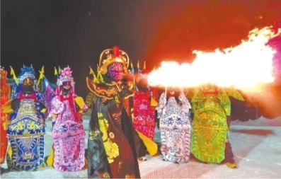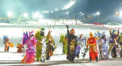 夜幕降临,华灯初上。吉林市万科松花湖度假区的雪道在灯光和烟火的映衬下化作一片奇幻舞台。伴随《林海雪原》《智取威虎山》等经典旋律,20多名滑雪爱好者身着京剧、川剧等戏服从山顶飞驰而下,赢得观众阵阵欢呼。