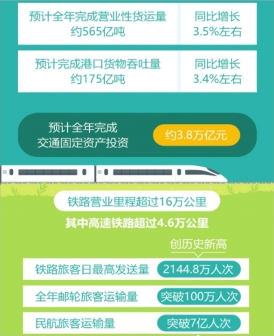 预计全年完成交通固定资产投资约3.8万亿元。铁路营业里程超过16万公里,其中高速铁路超过4.6万公里;新增公路通车里程约5万公里,其中新改(扩)建高速公路超过8000公里;新颁证民用运输机场5个。