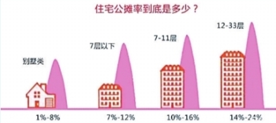 一般多层住宅的公摊面积约在10%~13%,18层以下的板式住宅公摊约在13%~15%,点式的楼盘公摊大多在15%~17%,而30层以上的住宅因为电梯数量的增多,公摊通常都在25%左右。
