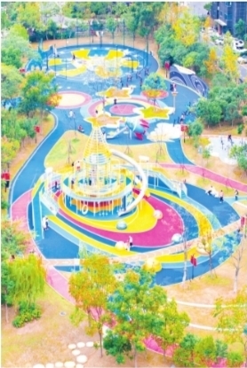 今年10月,东湖新技术开发区星空公园登上了热搜,这座会发光的口袋公园,创意十足。该公园位于光谷科技二路南侧、智苑小区北侧,是一座以宇宙探索为主题的口袋公园。儿童游乐区最亮眼的景观设施是一枚高11米、底径6.9米,矗立地面,蓄势待发的“运载火箭”,“火箭”同时具有高滑梯、秋千等游乐功能。一到晚上,公园内的“星轨”“行星”就会闪闪发光,十分梦幻。