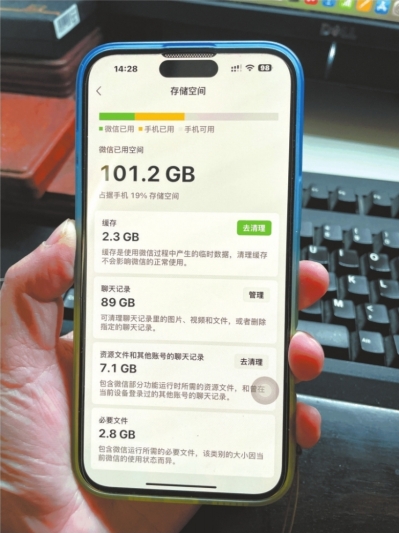 12月18日,市民张女士更换了某品牌的新款手机。换机前,她的手机微信占用空间达101.2GB。