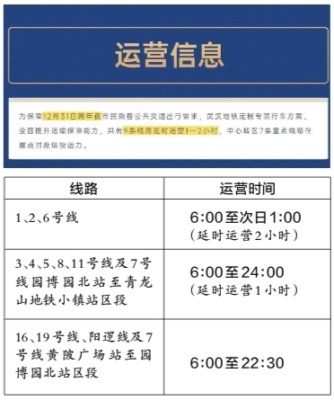 12月31日,轨道交通3、4、5、7(园博园北—青龙山地铁小镇)、8、11号线延时运营1小时,末班车发车时间为次日0时;轨道交通1、2、6号线延时运营2小时,末班车发车时间为次日1时。延时运营后,2号线末班列车到达端点站(天河机场站、佛祖岭站)的时间超过次日2时40分;江汉路站、循礼门站末班车的发车时间超过次日1时40分,珞雄路站末班车的发车时间超过次日2时。