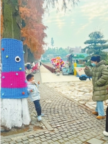 30日,记者抵达东湖绿道楚风园入口,只见周边的3棵梧桐树套上了颜色鲜艳的“毛衣”,装饰上萌趣十足的眼睛、嘴巴图案,途经游客大多都会凑近看看,拍照打卡。“有创意!之前在手机上有给风景照穿毛衣的特效,没想到网络世界照进现实了,太有趣了!”“00后”游客付欣芷和朋友路过欣喜不已,赶紧拿出手机拍照留念,“发到网上,大家一定都很喜欢”。