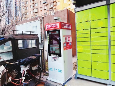在丰台区红狮家园小区,进入小区大门就可看到非机动车停车位旁的便民自助打印机和快递柜,此外,小区内还散落着直饮水机、自动售货机等装置。在隔壁的宋家庄家园小区,出售瓶装饮料的自动贩卖机就在小区大门旁。