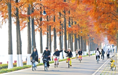 冬日的东湖绿道,也充满高饱和度色彩,人们在绿道骑行。 记者高勇 摄 |