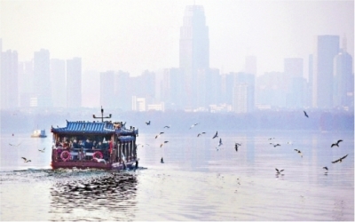 东湖湖面上,成群的红嘴鸥绕着游船盘旋,船上游客近距离观赏一路相随的红嘴鸥翱翔。 记者高勇 摄 |