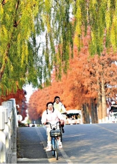 12月28日,冬日暖阳下东湖杉树林如油画仙境,东湖绿道湖中道两侧万株杉树纷纷换上了美拉德色系的“外衣”。 记者高勇 摄 |
