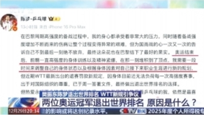 12月27日,乒乓球运动员樊振东、陈梦先后在社交媒体上发文宣布退出WTT世界排名。两位奥运冠军退出世界排名的表态在网上迅速引发热议,不少球迷查阅世界乒乓球职业大联盟(WTT)新规中的罚款细则,指责WTT不参赛就罚款的新规是“霸王条款”。