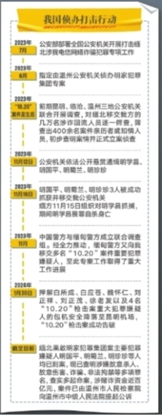 从2023年7月部署开展打击缅北涉我电信网络诈骗犯罪专项工作以来,依托中缅执法安全合作机制,公安部指挥云南、浙江等多地警方联合作战,全力开展案件侦办。在缅甸各方的大力配合下,缅北果敢自治区电信网络诈骗犯罪集团重要头目明国平、明菊兰、明珍珍被成功抓获并移交我公安机关,明学昌畏罪自杀,缅北果敢“四大家族”之一的明家犯罪集团彻底覆灭,代号“10·20”的枪杀中国公民案成功告破。