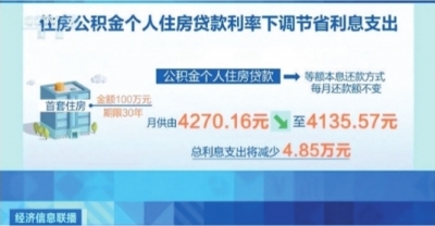 以一笔金额100万元、期限30年的首套住房公积金个人住房贷款为例,选择等额本息还款方式(每月还款额不变),月供将由4270.16元降至4135.57元,总利息支出将减少4.85万元。