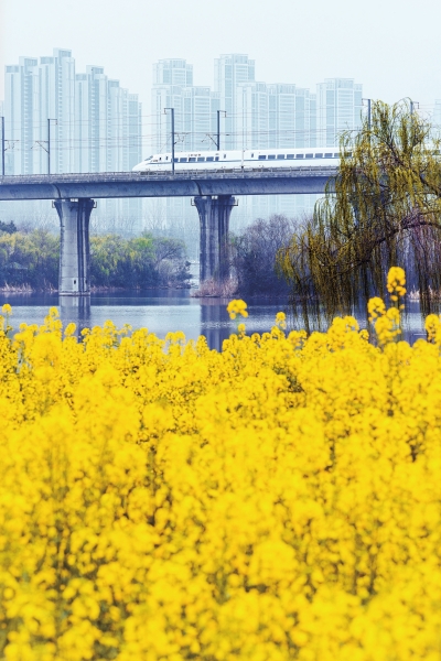 近日,春天的武汉迎来百花齐放,东西湖极地海洋公园旁边的湖边一大片油菜花盛开。黄灿灿的油菜花显得格外美丽亮眼,不远处的城际铁路不时有高铁列车疾驰而过,与油菜花海相映成趣。