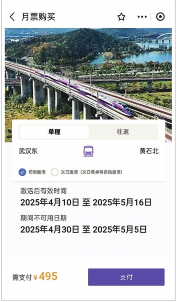 随后,记者尝试购买武汉东至黄石北的单向月票,选择立即激活,使用时间为4月10日至5月16日,其中4月30日至5月5日无法使用,这也与票务规则中“除国家法定节假日及前一日外,其余时间均可使用”的规定相符,同时,月票的使用时间也相应顺延,保障了最低30天的使用期限。