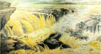 《黄河之水天上来》 画作展现壶口瀑布的壮观景象,黄河之水从高处倾泻而下,水雾弥漫,气势恢宏。画面笔触细腻,色彩斑斓,尽显大自然之雄伟壮丽。