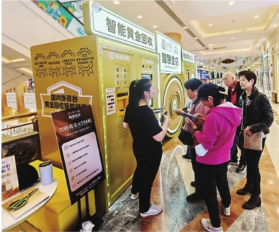 4月14日下午,上海市民在智能黄金回收机前排队等待回收黄金。