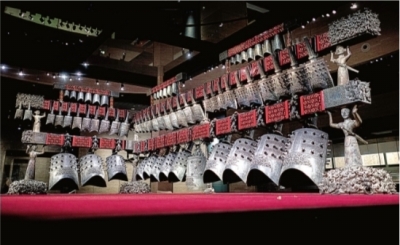 武汉东湖之畔,湖北省博物馆,“曾侯乙”展厅内,三层八组65件青铜编钟的原件悬挂在曲尺形的铜木钟架上。其上清晰可见的铭文,令参观者流连忘返。