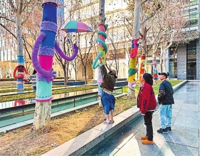市民刘女士,便是其中一位。她在这条街经营了一间家纺店,店门正对行道树。“这条步行街,共种了11棵树。大约去年12月中旬,志愿者们来给它们穿上了‘毛衣’,我看他们当时费了不少劲。”行道树穿上多巴胺配色的“毛衣”,为冷色调的冬季增添了一抹亮色,还有不少人过来拍照打卡。