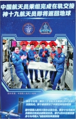 据新华社电 神舟十九号、神舟二十号航天员乘组昨日进行交接仪式,两个乘组移交了中国空间站的钥匙。