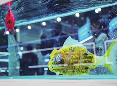 5月14日,参观者在2025世界数字教育大会教育数字化成果展上参观智能仿生鱼。