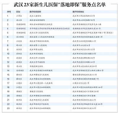 为进一步推进新生儿医保“落地即保”服务,武汉市按照服务场所、服务事项、内部管理、队伍建设、服务流程、设施设备“六统一”的标准打造“院端”新生儿医保“落地即保”服务点,“成熟一批推广一批”。截至目前,我市已有23家医疗机构开设新生儿医保“落地即保”服务点。