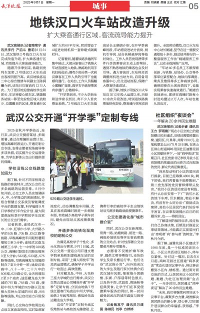 同时,武汉公交在新湾路、常青一路、姑嫂树路、前进一路、佛祖岭地铁站等学生客流密集的公交站点,针对性部署公交志愿者开展专项服务。