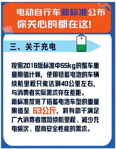 将使用铅酸蓄电池的电动自行车整车质量上限由55公斤提升到63公斤;