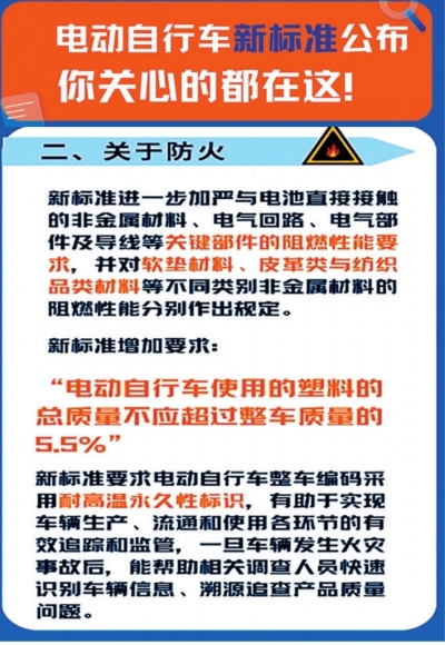 明确了电动自行车使用塑料的总质量不应超过整车质量的5.5%;