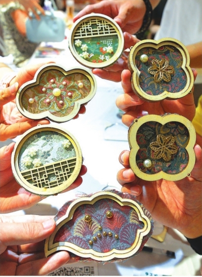 “它飘逸灵动,代表着如意和高升。”“它连绵不断,寓意生命力旺盛与吉祥。”“这是四位君子的象征,代表高洁的品格。”在手工DIY环节,传统织锦纹样、饰物在现代工艺和奇思妙想中产生了多款浪漫组合,不少同龄人协作完成织锦文创手作。