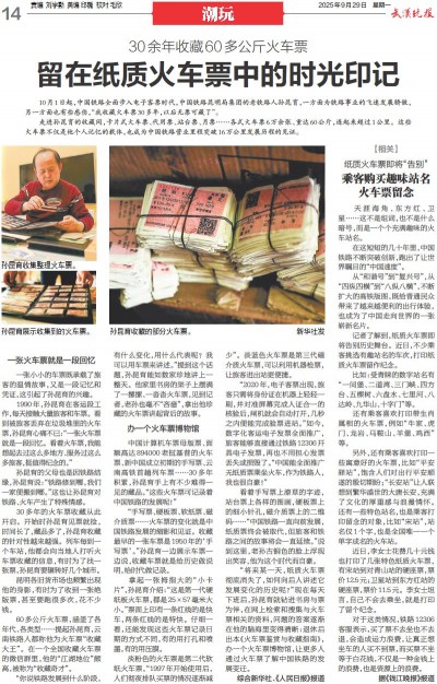 走进孙昆育的收藏间,卡片式火车票、代用票、站台票、月票……各式火车票6万余张、重达60公斤,连起来超过1公里。这些火车票不仅是他个人记忆的载体,也成为中国铁路营业里程突破16万公里发展历程的见证。