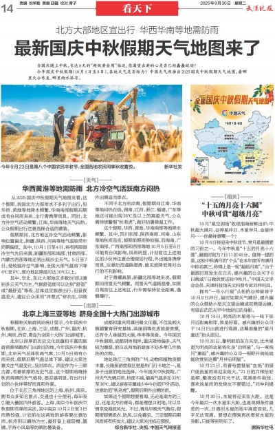 不同于北方的凉爽,假期期间江南、华南等地闷热在线,湖南、江西、浙江、福建、广东等地还可能出现35℃及以上的高温天气,公众需持续警惕“秋老虎”,做好防暑降温工作。