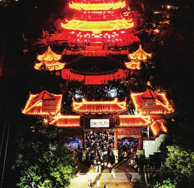 10月7日晚,游客在武汉黄鹤楼游览(无人机照片)。