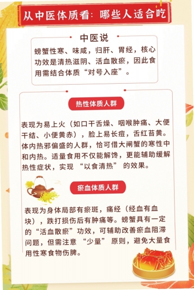 专家提醒:螃蟹属于性寒之物,并非人人都适合食用。如何才能在享受舌尖狂欢的同时,为全家人的健康保驾护航?湖北省中医院脾胃病科主任医师黄鹤为我们揭开大闸蟹的“饮食密码”,从营养构成到食用之道,全方位解读大闸蟹的正确打开方式。