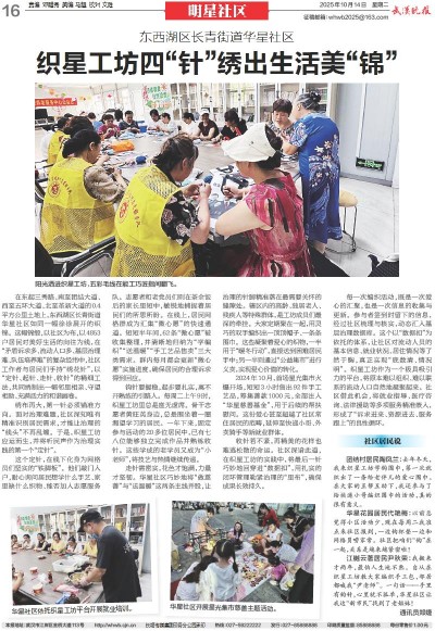 江樾云著居民尹秋荣:我搬来才两年,最怕人生地不熟。自从在织星工坊教大家编织手工包,邻居都喊我“尹老师”。一句话——手里有钩针,心里就不孤单,华星社区让我这“新市民”找到了老姐妹!