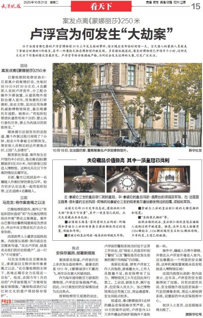 媒体援引法国官员的话报道,整个作案过程只持续了7分钟,劫走9件拿破仑时期珠宝。等安保人员稍后到达作案地点时,已经“人去楼空”。