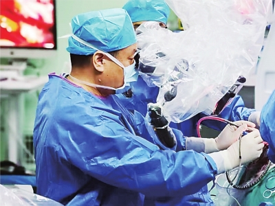 随后,垂体瘤手术如期开展,神经外科主任李俊在显微镜下小心翼翼地分离肿瘤与周围正常的神经、血管组织,最终将垂体瘤完整切除,最大程度保护了正常的垂体功能和视神经。