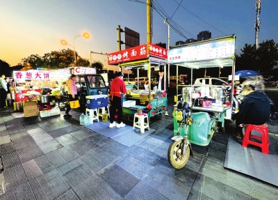 不远处,“兰姐饮品”摊位前,三位年轻女孩前来选购玉米汁。“我们在这里上舞蹈课,经常光顾这个夜市,这里的甜品口感特别好。”记者注意到,摊主曲凡兰麻利地固定餐车、铺设地垫、打包饮品。除了招牌的玉米汁,她还提供银耳汤、冰糖雪梨等多种选择,不少老顾客排队等候打包。“干净的环境才能吸引回头客。”曲凡兰深谙此道。