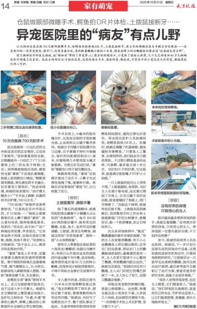 “很多人觉得异宠奇怪,但在主人眼里,它们都是家人。”杨斌说,“我们异宠医生能做的,就是用自己的专业,守护好这些家人,让它们能更舒服、更健康、更长久地陪伴宠主。”